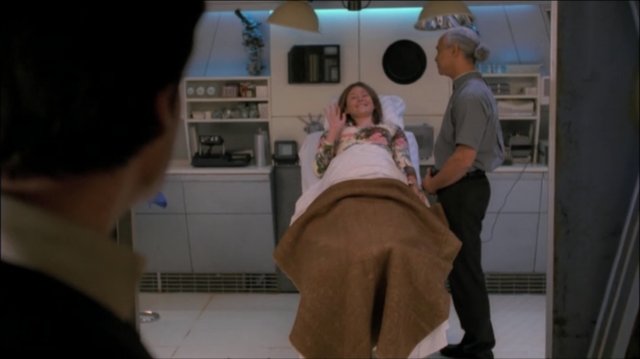 The rest of the crew is up in the cockpit having a good laugh at what a jerk Simon is, and Patience– the woman who shot Mal that one time that no one will shut up about– calls Mal. They work out an arrangement to meet and Patience will buy the loot they stole, because she doesn’t care about the Alliance.
