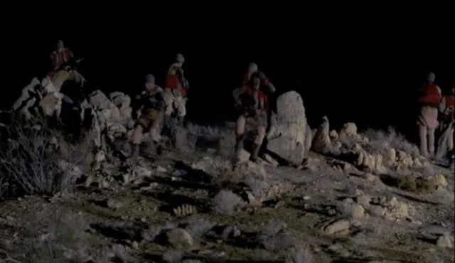 Dobson is frantically searching through a bag and tries to get a signal on some kind of communicator, but throws it against a wall in frustration before pulling out a gun.