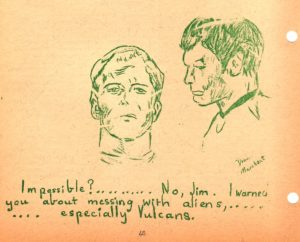 Additionally, as Tansy Rayner Roberts writes in an excellent essay on the piece, “a cartoon underneath the final page of the story shows Bones saying to Kirk: ‘Impossible….. No, Jim. I warned you about messing with aliens…….. especially Vulcans.’ (The look on Kirk’s face in the cartoon implies he has just been told about the existence of slash fiction. Oh, sweetie.)”
