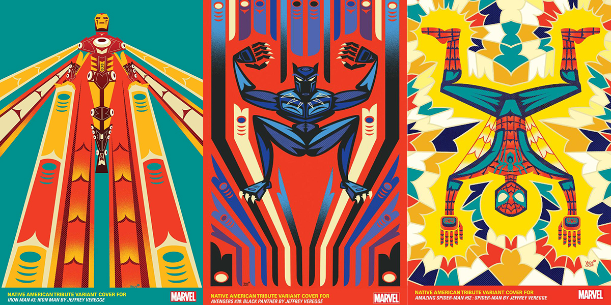 The featured superhero art above is by Jeffrey Veregge, “an award-winning Native American Artist and writer from the Port Gamble S’Klallam Tribe near Kingston, Washington.” Jeffrey’s art blends his distinctive line form design and aesthetics with modern comic book and genre elements. Not only had Jeffrey created the stunning Marvel variant covers above and created other awesome comics-inspired design, but he’s recently created covered for IDW’s Star Trek Voyager series.