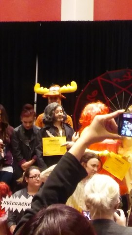 Kim Rhodes singing karaoke, as promised, with the child who asked her to in her panel. The kid wanted to sing Let It Go.
