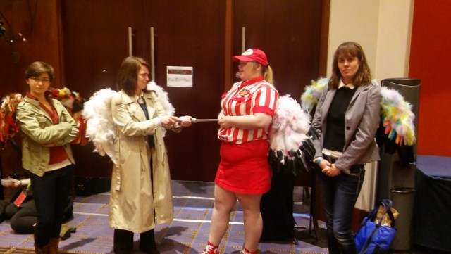 Everywhere I turned, I saw fans dressed in the plaid flannel shirts favored by the Brothers Winchester. Somewhere, someone who sells tan trench coats is wondering why their sales have skyrocketed. Trucker hats like those worn by popular character Bobby Singer, black angel wings, blue neckties, t-shirts that declare the wearer a “Dean girl,” a “Sam girl,” an angel, a demon, and even fandom in-jokes like an actual Moose suit abound. I have included below some pictures of some of the more creative fan endeavors in the area of cosplay:
