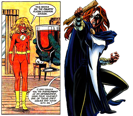 Soon after Wally became the Flash, he encountered Blue Trinity, three members of a USSR experiment to duplicate the Flash’s abilities. The members of Blue Trinity weren’t all that stable and were later succeeded by the more heroic and affable Red Trinity group. One member of Blue Trinity was Ivana Christina Borodin Molotova (often simply called Christina Molotova). Christina constantly looked for someone to follow. She later fell in with Vandal Savage and called herself Lady Savage. Then, in Flash volume 2 #50 (the same issue where Wally got his metallic suit), Vandal Savage gave her one of Wally’s suits. She cut up the cowl and was now Lady Flash. Initially she fought him, then fell for him and stuck around for a bit before leaving to find a new life. She showed up again later as the mistress and warrior of the evil speedster Savitar under the name Lady Savitar.