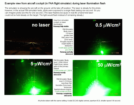 The above pictures were taken from a Federal Aviation Administration flight simulator, depicting what it is like for a pilot when a laser flashes into the cockpit; as one can see from the fourth photo, the laser completely blinds the pilot for the duration of the flash. The photos were taken with the aircraft on the ground at the take off position, with the laser remaining steady for the photos, though pilots were shown a one second flash of the laser in the simulator in order to represent how a handheld laser cannot remain steady on a moving target in real life. Click on the picture to enlarge.