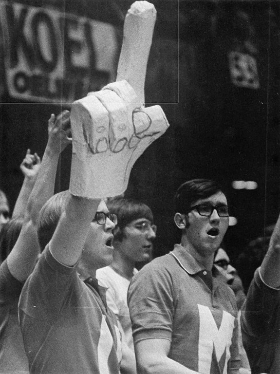 The comically oversized hand was first invented by a man named Steve Chmelar back in 1971 to show support for his team at the Iowa State High School Boy’s Basketball Finals. The original hand was constructed from paper mache. Take a look at this picture of Chmelar with the hand from the 1971 Ottumwa High School Yearbook: