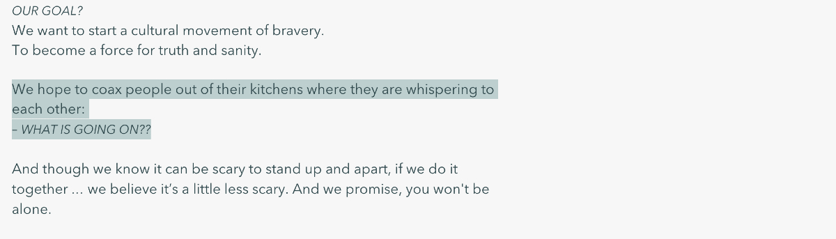 There is so much to unpack in this line of copy, seemingly written by a copywriter who had Katie Britt’s rebuttal to The State of the Union address on in the background: “We hope to coax people out of their kitchens where they are whispering to each other: – WHAT IS GOING ON??”