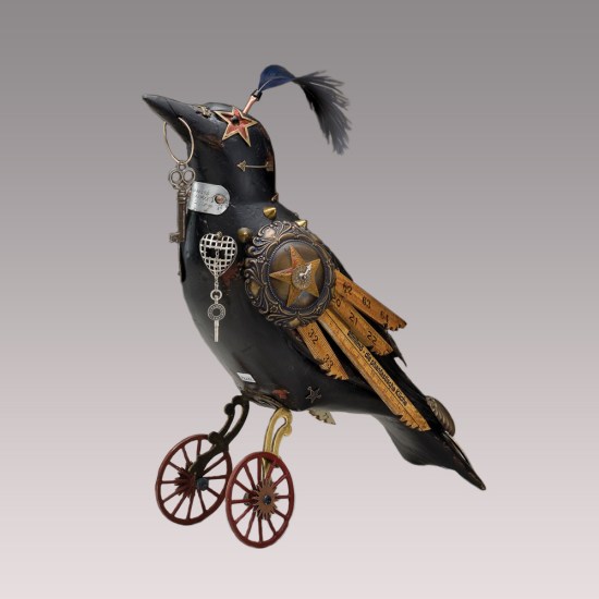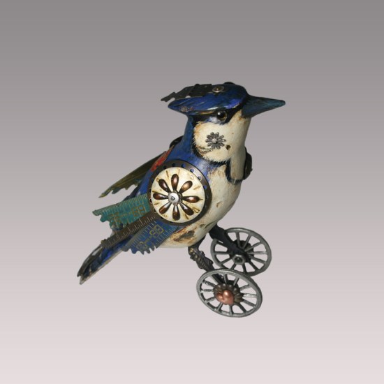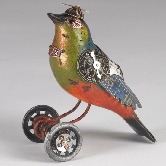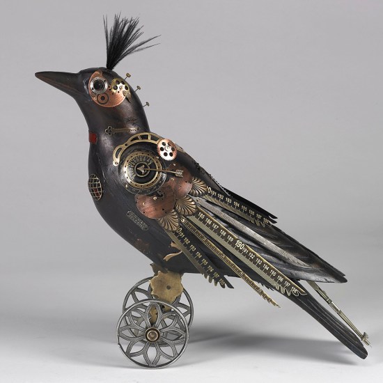 This handsome wooden bird statue started life as a lowly decoy, presumably to distract live birds from a wily human hunter. But it has arisen reborn and renewed with some found-object plumage thanks to Jim and Tori Mullan. In true steampunk fashion the natural flies headlong into the mechanical, and the result is a splendid display of strange robotic song birds. What’s more, some of them even have little hats.