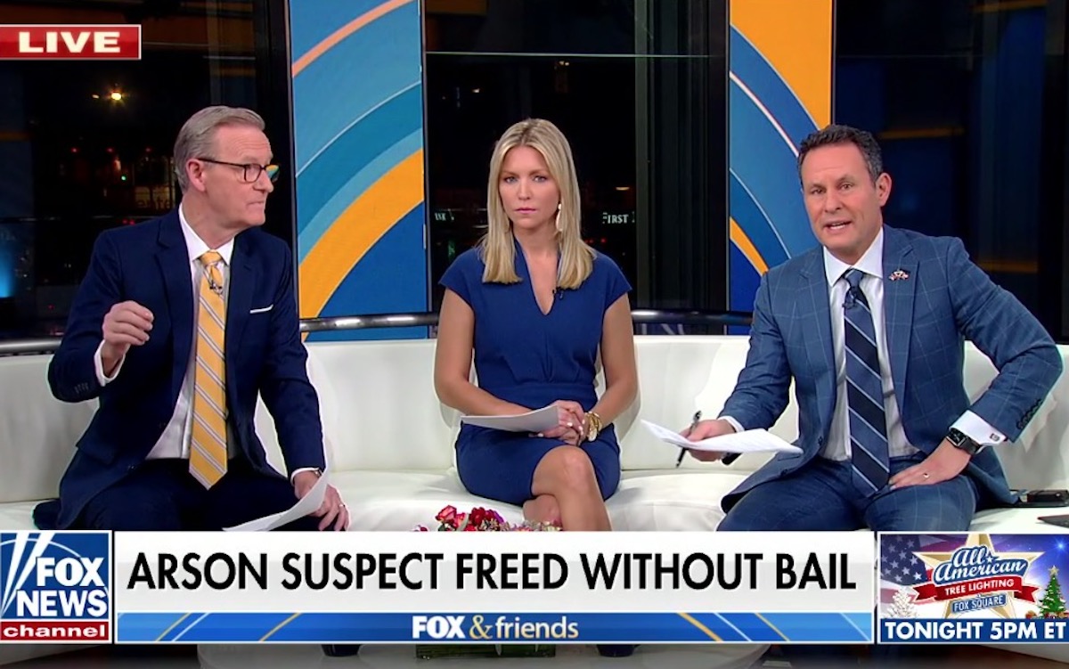 This would only have been a bail-eligible offense if a person had been injured or if the fire was a suspected hate crime, “and apparently lighting a Christmas tree on fire is not a hate crime,” Steve Doocy said incredulously.