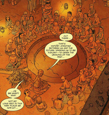 Page 1 sets the conceit for the narrative: an older person who appears to be a man sits in the water-room of the wives’ old chambers, narrating their history to an assembled group of children. The crowd-shot, like most crowd-shots, seem to have a lot of male faces in there! (And lining the walls, which I cropped.) I doubt that the male authors of this comic intended this framing device to symbolize their male avatar addressing a comic-book audience that they expect to be disproportionately male, but haha it sure is ironic in retrospect.