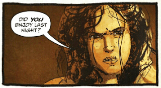 First of all, this comic is ridiculously rapey, especially given that the movie attained a lot of feminist acclaim precisely because it wasn’t rapey. It was a movie about sexual victimization without showing any rape on-screen. I’ve already seen dudes defending the comic with pretend-surprise and things like “gosh, you mean the rapey guy was raping those women all this time! I’m shocked!” But the thing is, we didn’t need to see rape in order to know that rape was going on. That was true for the movie; it is true for any backstory comics.