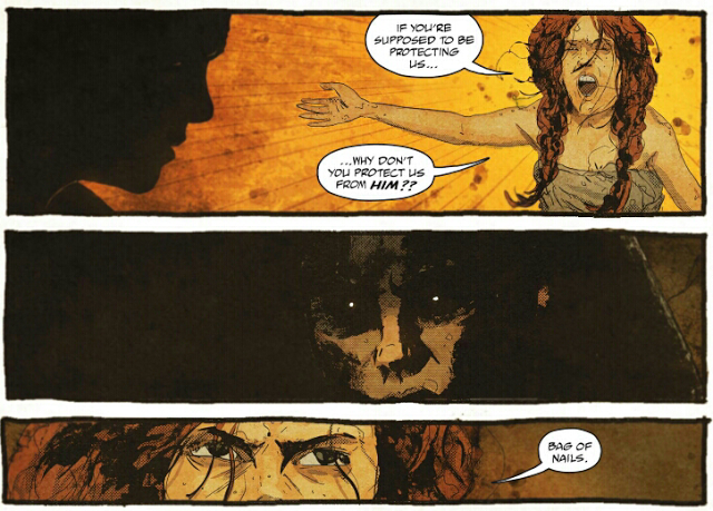 Indeed, by showing the rape and sexual assault over and over again in this book, that will likely overwhelm the wives’ valid complaints about freedom and reproductive freedom. It doesn’t–or shouldn’t–matter whether Joe is treating them “well” or whether he’s hurting them. They aren’t free, they deserve to be free, the end. The added rape sequences only serve to provide a validity prism for the audience: yes, the apocalypse out there is rotten, but it really was sufficiently terrible enough in Joe’s captivity to justify wanting to leave.