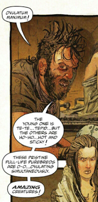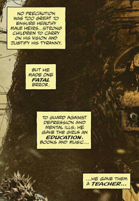 Page 4 explains why Page 3 was “necessary”: the vaginal exam is to check when the wives are ovulating. Why is this something Joe would check for? Is he only raping them during the ovulation window? (The book flirts with answering this “yes” without committing to it.) Does that mean he reallyis interested firstly in reproduction with his captives? (More on that later.) The real reason seems to be so that Rictus can try to rape Angharad and now Joe needs a reason to give the wives another gift: their protector, Furiosa. (Isn’t it great how literally all the wives’ agency has now been reduced to Joe giving them everything ever? More on that later.)