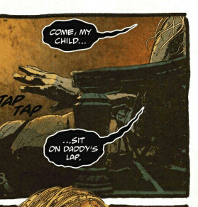 Page 28 has Joe telling Cheedo to come “sit on daddy’s lap”, and I guess now is the time to bring up that several mentions have been made to her being young and not ovulating yet, and that Joe hasn’t started raping her yet. Now he declares his intentions to do so.