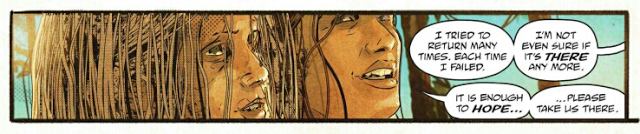 Page 29 has Joe viciously raping Dag in revenge, while Furiosa stops the wives from intervening. Despite the fact that since Angharad is visibly pregnant and his favorite, she might well have been able to intervene effectively. Page 29 also has Joe detailing a list of everything he’s given his ungrateful wives in case we’ve forgotten since the last five minutes that they owe their education to him. Page 30 has Furiosa tell the women about the green place while they make rapturous faces and say “take us there” without any sense of planning or cooperation going into this. Just an Exceptional Woman and her cargo.