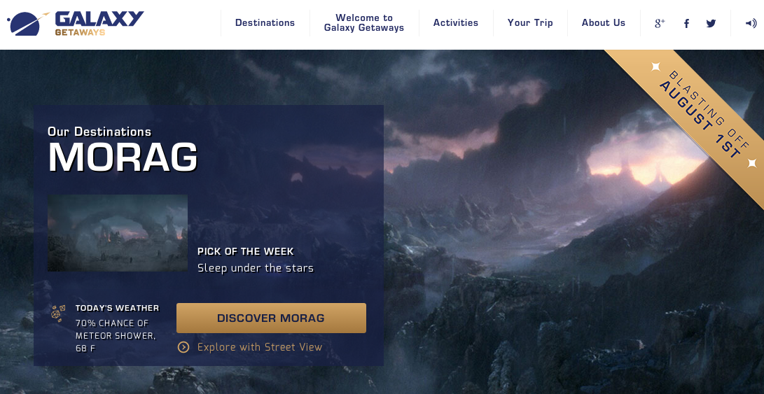 Viral in-universe marketing campaigns can be pretty hit-or-miss. For every Primatech Paper ARG or Capital Couture, there’s a dorky Daily Bugle Tumblr that’s trying just a bit too hard. Galaxy Getaways, the new website to promote Guardians of the Galaxy, places itself absolutely in the former camp by pretending to be an interstellar travel company with a fantastically Douglas Adams-esque sense of snark.