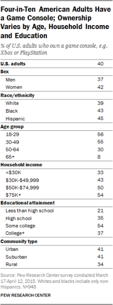 According to the data above, 39% of white people in America own a gaming console, 43% of black people own one, and 45% of hispanic people own one. (Someone who understands statistics better than I do should go cross-reference this data with the demographics of the US and then report back.)