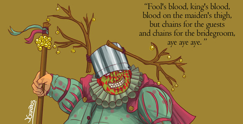A bit of back story first: Patchface, the jester of Stannis’ court, used to be a really witty and clever slave in Volantis. He was picked up by Stannis’ dad Steffon and was in the shipwreck that killed both Steffon and his wife (officially making the Baratheon boys Disney princes, considering the dead parents and everything). Anyway, three days after the wreck, who should wash up on shore but Patchface! Miraculously, the freed slave coughed up water and went on living with about a 1/4 of his brains left. He’s no longer clever, but he pleases Stannis’ daughter Shireen, so he’s kept around.