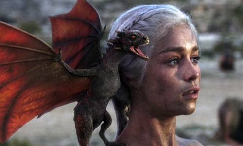 Dany has decided to walk into the fire, reminiscent of the way women in some cultures are expected to burn themselves alive after their husbands’ deaths. (The ethnography of the Dothraki is a MESS.) Of course, the next morning (same night? whatever), she is untouched, and she’s got three new baby dragons, two of which are placed conveniently in front of her nethers. They are so cute! Don’t forget to feed them three times a day with baby dragon food, give them plenty of villages to burn and oh shit what are we all getting into next season.
