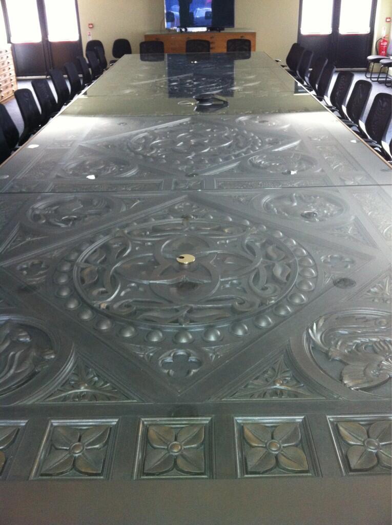 The Gates of Qarth that so ominously barred Daenerys from entering the trade city in the second season of Game of Thrones now serve a much more noble purpose, barring the crew from having to put their paperwork on their laps. It seems that, after Daenerys moved on from Qarth, the imposing doors became the coolest, most intricate conference table, according to Game of Thrones employee Cat Taylor, who tweeted this picture after asking followers to guess at the table’s origins. Unfortunately, the Iron Throne is not at the head of the table, but the table itself is very impressive. Take a look at another photo, and the gates in context, after the jump.