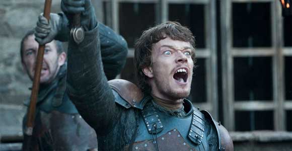 In Winterfell, Bolton’s men have the castle surrounded and Theon knows he can’t win. Maester Luwin is still trying to help Theon because as he tells the kid, “You’re not the man you’re pretending to be.” He counsels him to run away and join the Night’s Watch. You can tell Theon considers it. He talks about being a captive and going home only to be looked down upon; it might be the first time he’s been genuine and bare. It got to me. Still. The idgit ignores Luwin and gives his men a rousing pep talk about fighting the Northmen. At first it looked like they were behind him 100% but they really don’t want any of it, and in a moment that was more hilarious than it should have been, his first mate knocks him over the head and puts a hood over him. The funny moment ends with a slap in the face as he also stabs Maester Luwin with his spear.