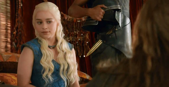 We’re back near Yunkai where Daario strokes a sharp-looking knife with a woman’s body for a hilt and Mero and Prendahl discuss what to do with Dany. Mero goes on again about how Dany is basically just a piece of meat to him (while he gropes a prostitute sits on his lap) and Daario insists he prefers women who actually want to have sex with him, and men who want to kill him. After a bit more discussion they decide Dany is to be assassinated and Daario winds up with the task.
