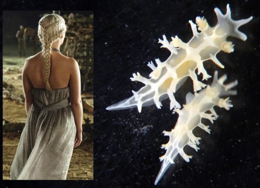 Just why did this species come to be named after a Game of Thrones character? Silva explained to Papelpop.com. The google translation reads, “The standard of the silver band on the back of the slug reminds braids Khaleesi of silver hair, especially in the last episode of the first season of the show. Besides silver color, the species is one of the smallest sea slugs, as well as Khaleesi is also described as low and new.”