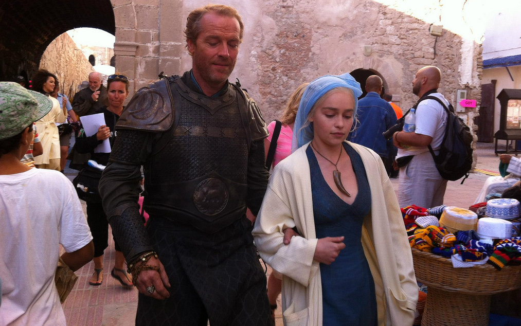 It’s been a few days since we’ve had new Game of Thrones set photos, hasn’t it? This most recent bunch comes from Morocco, where they’re filming the Astapor scenes that will serve as a major turning point for Daenerys Targaryen this season. Hit the jump for Jorah Mormont, a lady with a leopard-skin sleeve tattoo who I assume is an extra and not a particularly awesome crew member, our first look at slaver Kraznys mo Nakloz, some possible-Unsullied taking a few minutes to chill, and Daenerys in a snazzy yet comfortable-looking tunic-trousers combo that I’d buy in a second.
