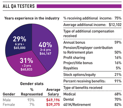 Borderhouse makes the good point that some of these numbers may result from the lack of women in the industry: many of those who are in may have come to it recently, and therefore have less seniority and commensurately less compensation, a relationship not highlighted by GDM. I’ve highlighted QA testers here because the job’s notorious reputation for having high turnover and poor working conditions make it more likely to be exempt from such an explanation, but this is definitely a pattern that’s worth more research. You can see all the numbers here.