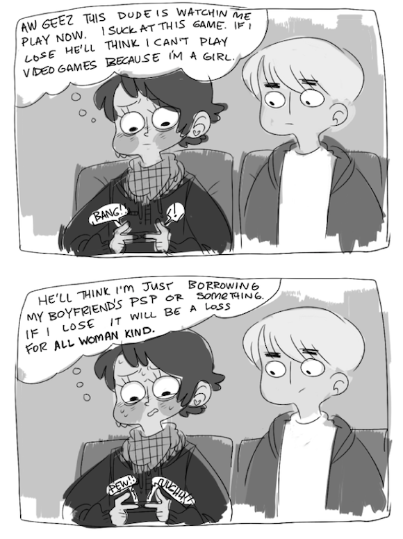 Only two panels into this comic and my inner voice was already screaming “YES. YES EVERY TIME I PLAY IN FRONT OF STRANGERS.” See also: “I better not choose to be the singer in our Rock Band group even though I sing really well because people will assume I can’t play any of the other instruments because I’m a girl and don’t play games,” and “If I pick a Wario game for the PAX East freeplay area because I’m really curious about them will some dude think it’s evidence that girls don’t play hardcore games?” Because I know how it works. It’s absurd, as Sailor Swayze points out by the punchline, how this preconception can make you feel like the full weight of female gamer acceptance rests on the outcome of a single match or moment of your own gameplay.