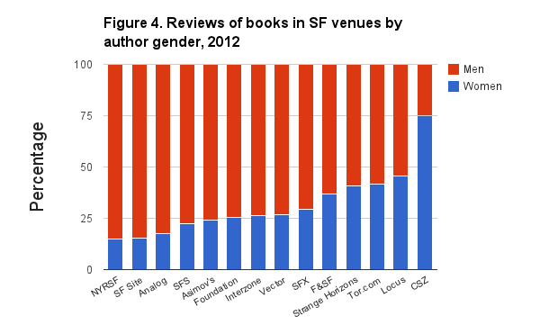 Ah. No. That’s the bad news. For nine of the 14 publications included the percentage of reviews of female-written books is around or under (sometimes well under) 25%. Locus itself is about 50/50 (good for them!), and one magazine, Cascadia Subduction Zone (mission statement: “to treat work by women as vital and central rather than marginal”), reviews more books written by women than by men. You can see the chart here. It’s pretty depressing.