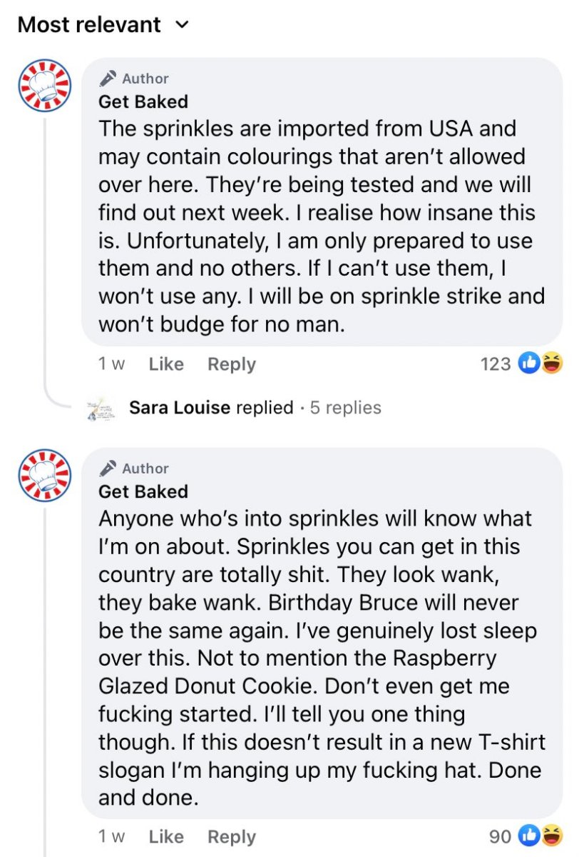 “The sprinkles are imported from USA and may contain colourings that aren’t allowed over here.” Get Baked acknowledged that “I realise how insane this is,” but these sprinkles are serious business. “I am prepared to use them and no others. If I can’t use them, I won’t use any. I will be on sprinkle strike and won’t budge for no man.”