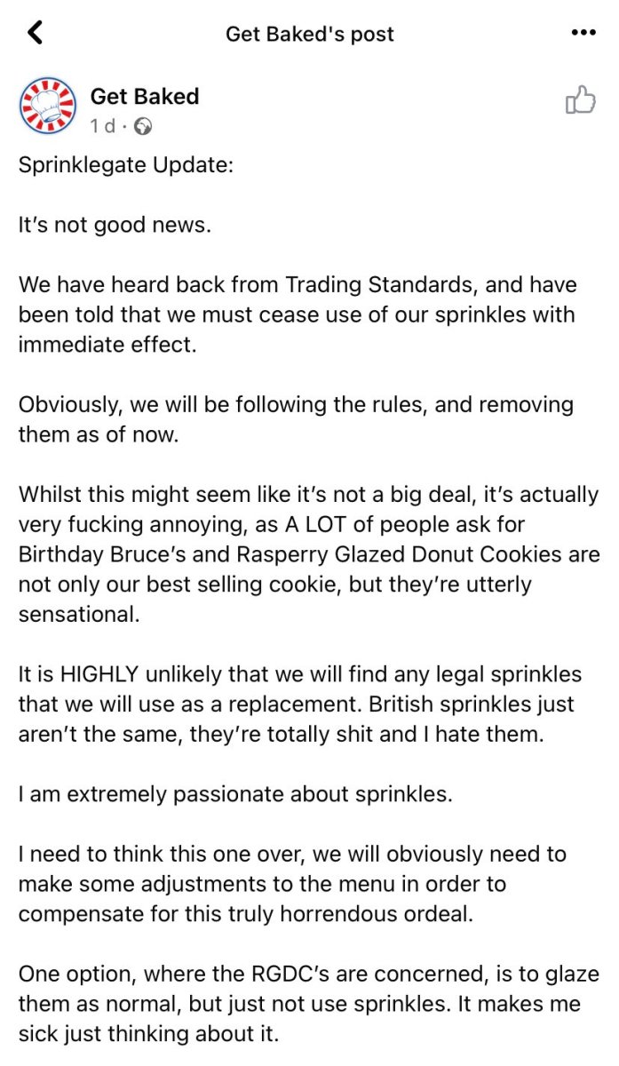 Things took a turn for the worse with a Sprinklegate update: Trading Standards came back and told the bakery to cease and desist use of those dastardly American sprinkles posthaste.