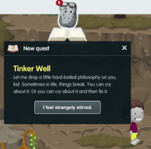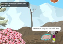 While the tone and the writing of the game are its greatest strengths, the gameplay is solid too. The interface is terrific at accepting input from mouse or keyboard so you can run around the level like a stage in a platforming game, collecting exp bubbles if you want to, or just click the end of the zone to automatically walk there while you go make a sandwich or something. Your time in world is largely comprised of completing quests that come with newly learned skills, at least at the beginning. For instance, you learn to nibble piggies for meat and you get a quest along the lines of “Yo, go nibble 7 piggies, man.” You also spend time collecting and eating food to maintain energy, drinking drinks to maintain mood and collecting money, “currants,” to spend on tools, food, drinks, or even a house.