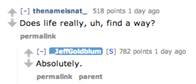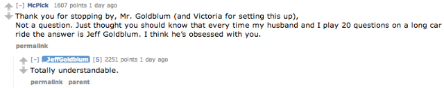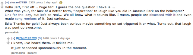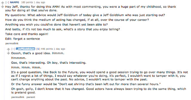 Just when I thought it wasn’t physically possible for me to love Jeff Goldblum any more than I already do, he goes and does an AMA on Reddit. It’s everything you’d want a Goldblum AMA to be: weird; funny; a little awkward; full of “uhs,” “ums,” and “you knows”; and completely awesome. Let’s all get Goldbluming and check out the highlights.
