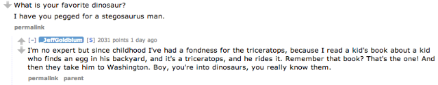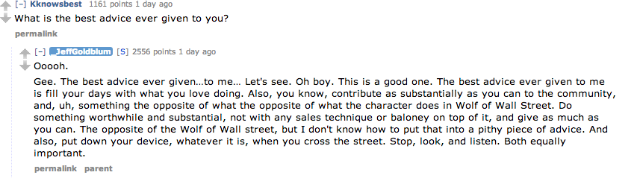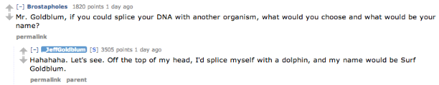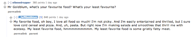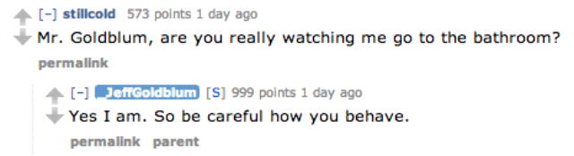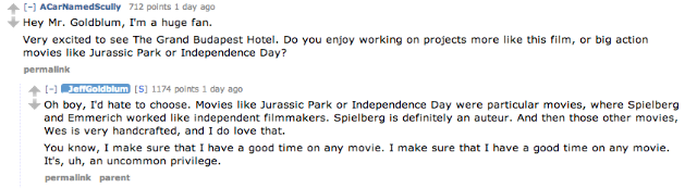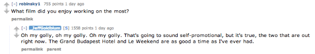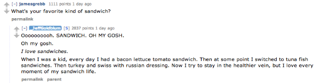 After informing all of us lesser humans that his films out in theatres right now (Grand Budapest Hotel and Le Weekend, if you were wondering) rate “ten Goldblums out of a possible ten Goldblums,” Goldblum told Reddit to go ahead and “[a]sk me anything, I’m an open-faced sandwich.” Let’s get to the good stuff, wherein Goldblum types exactly as he speaks.