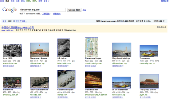 To the left: it appears that Google has stopped censoring some of the content that it has for years, including the infamous photo of the man blocking the tank during the protests at Tiananmen Square in 1989. (Reproduced in Google.cn image search results, above.) To the right: last night, Google missed a deadline to reregister as an Internet Content Provider in China, a necessary designation under Chinese law to provide search services within the country.