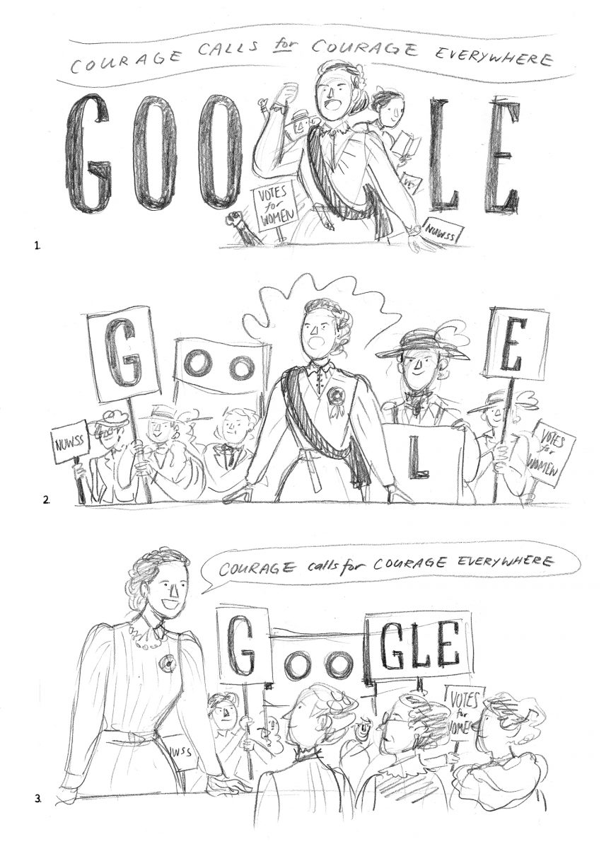 In the Doodle sketches by Pearl Law, you can see Fawcett’s famous quote: “Courage calls for courage everywhere, and its voice cannot be denied.”