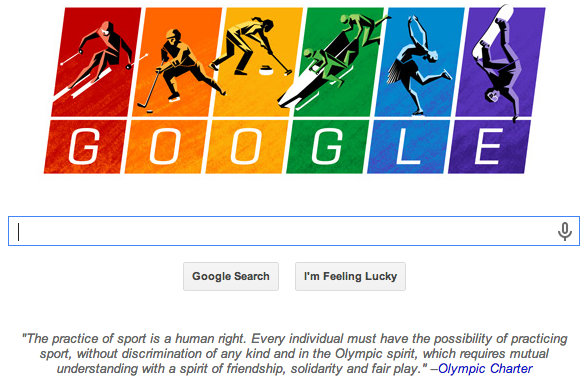 Google’s letting everybody know where they stand on the Sochi Olympics, with a rainbow Winter Olympics doodle that links, not to Olympic coverage, but to a search for the Olympic Charter itself. The Charter’s statement on equality in sports also appears below the search bar.