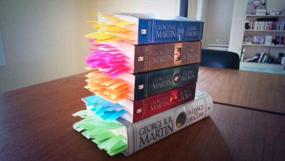 This is just what you need to brighten your day: every character death in George R.R. Martin‘s series, marked with post-its. I don’t know who is crueler: Martin, or whoever went through and counted them all up. It’s like a strange rainbow of murder.