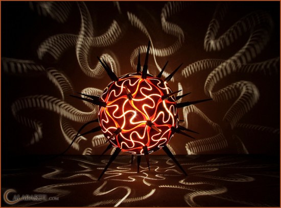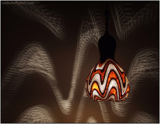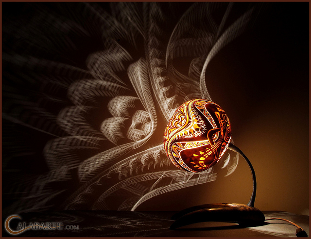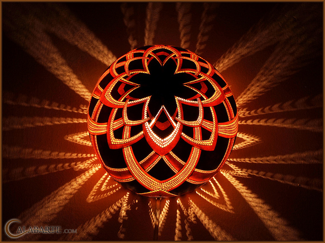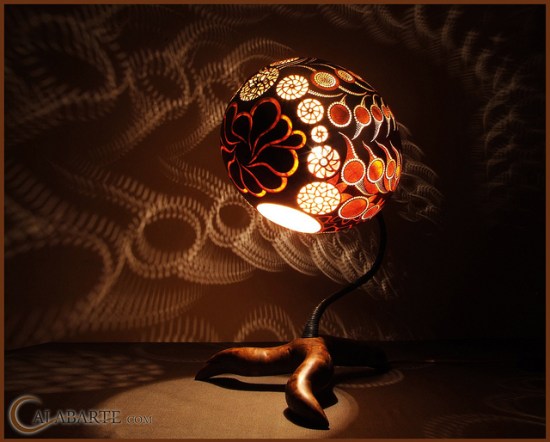 Calabarte turns regular old gourds into pretty lamps by carving intricate designs and patterns into the gourds, which in turn, casts equally intricate designs and patterns onto surrounding surfaces after the gourds are stuffed with lights and flipped on. It’s like a tasteful jack-o’-lantern. Read on below to see more artsy gourd-lamps.