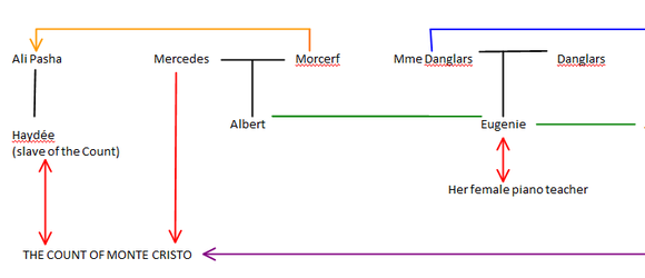 This is merely a portion of a diagram of the character relationships in The Count of Monte Cristo that I inexpertly threw together in Microsoft OneNote ages ago for no reason other than that I really kinda like the book a lot.