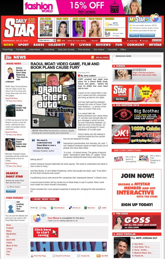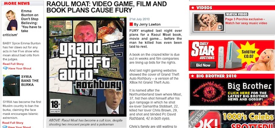 In the wake of the Moat saga, British tabloid The Daily Star made the inevitable outraged connection between real-life violence and video game violence. What made this unusual was that rather than claiming that video games had inspired the tragic acts in real life, The Daily Star asserted that the next Grand Theft Auto game would be based on the killer, causing “fury” to erupt last night. This would indeed be furiously eruptive, except for the fact that it’s totally made up.