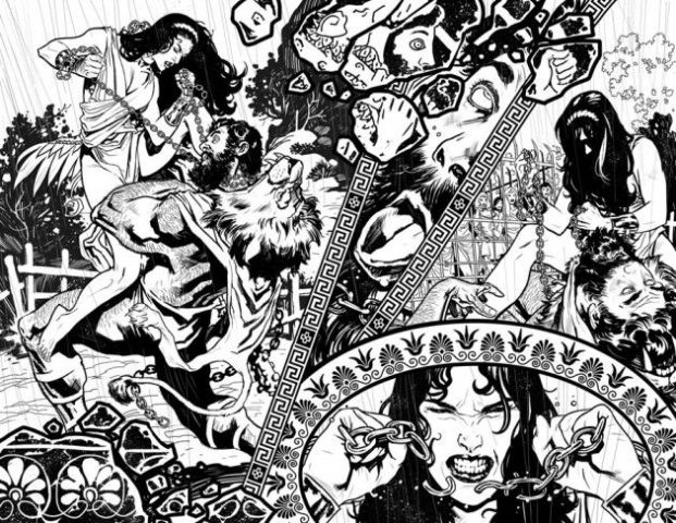 What would a society of immortal women that’s been around for 7,000 years have done? They wouldn’t still be chopping men’s head’s off; they’ve got art and architecture and philosophy and poetry and it’s got nothing to do with men. So Yanick Paquette did this amazing design job, where there are no phallic objects. The only phallic objects are like these Greek towers that are almost like this haunting echo of the culture they came from.