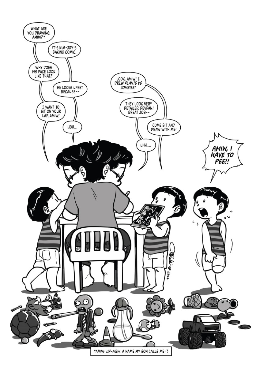In the backmatter of Turtle Bread there are extra pages showcasing the chaos of trying to renovate, raise kids, and work on a graphic novel all at once. Kim-Joy says artist Alti Firmansyah came up with the idea, “and I absolutely love how she’s picked out all the chaos! She’s even got the lawnmower in the background and the details on the plastic rug that I had! I love it and it’s such a great memory to look back on.”