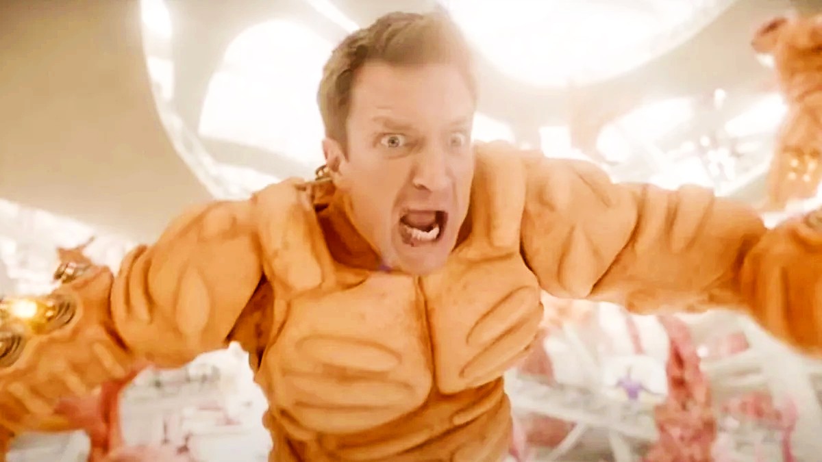 Fillion’s Master Karja shows up in Guardians of the Galaxy Vol. 3 on the Orgoscope—the High Evolutionary’s spaceship made of living matter. One purpose of the base is to store all of the files for the High Evolutionary’s experimental subjects. As a result, the Guardians enter the Orgoscope looking for files about Rocket (Bradley Cooper). However, infiltrating the Orgoscope is no easy task as numerous sentries guard the place and are employed by the High Evolutionary. One of these security guards is Master Karja. His appearance alone within his big fleshy bubble suit is a dead giveaway that his character isn’t very serious.