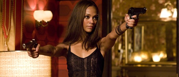 So in the villain camp we have Ronan; Thanos; Karen Gillan‘s bald lady space pirate, Nebula; Djimon Hounsou‘s Korath the Pursuer;…. and Saldana’s Gamora, who, as it turns out, starts out evil before joining the Guardians.