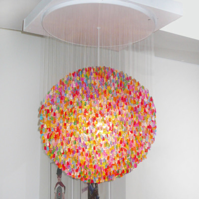 Our plans for an edible room in the basement of our secret polar stronghold must go unrealized. Much to our disappointment, this candy-chandelier is made of 5,000 hand strung acrylic gummi bears.