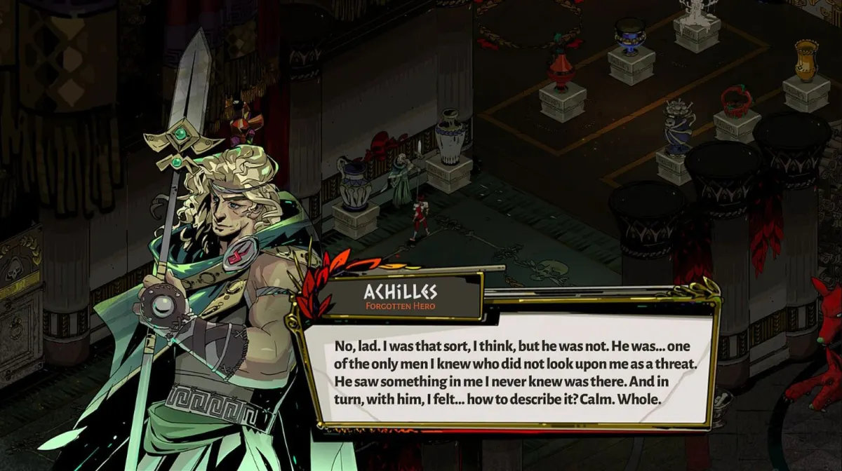 At some point in your playthrough of Hades, you realize that Zagreus kind of becomes a relationship fix—whether or not the couple agrees to his interference. As much as he wants to reach the surface he also wants what’s best for the people he cares about. As you talk with Achilles (Zagreus’ teacher) you find out about his relationship with Patroclus, who’s up in Elysium lamenting everything that happened that led to him being there. Achilles made a deal with Hades so Patroclus could reside in Elysium after he was killed, but that means Achilles can never leave the Underworld.