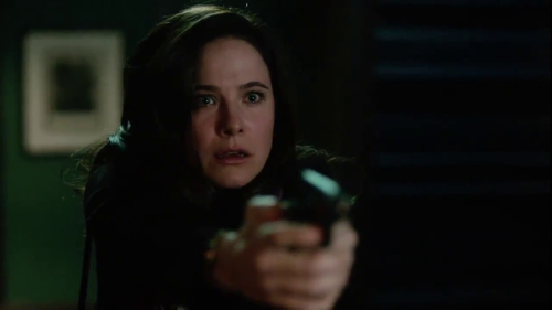 The chase is on! Hannibal walks after Alana slowly, and Alana makes the classic horror movie blunder of going up the stairs when she should have run out the door. She puts fresh bullets into her gun’s…bullet holding…thing? I don’t know much about guns. Anyway, Alana’s ready to blow Hannibal’s fancy head off his well-tailored shoulders when a movement in the shadows catches her attention.