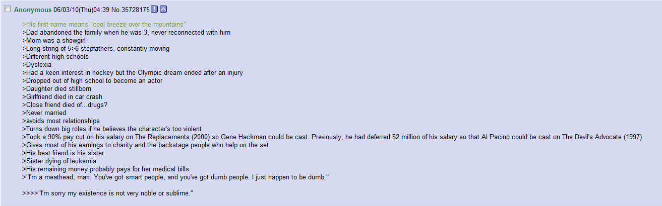 The most upvoted comments on the previously-mentioned Reddit thread weren’t the typical puns and novelty account postings; I would argue that the heart of the Keanu revival isn’t the picture of Sad Keanu on a bench that you’ll no doubt see elsewhere on the Internet today, but the list of ‘Keanu Facts’ that originally appeared on 4chan: (pic)